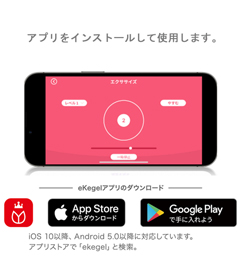 各アプリストアで「ekegel」と検索し、無料でインストール可能です。iOS10以降、Android5.0以降に対応しています。